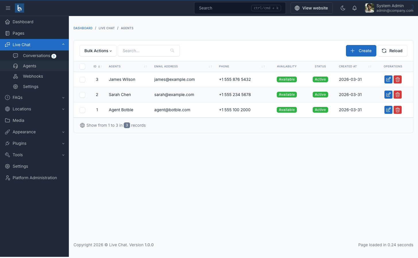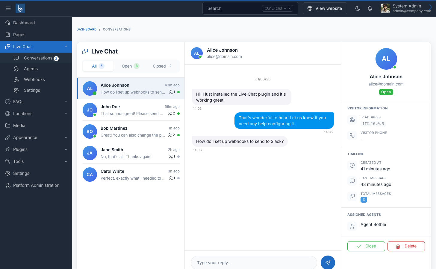 Go to Admin Panel → Live Chat → Conversations to see the messenger.