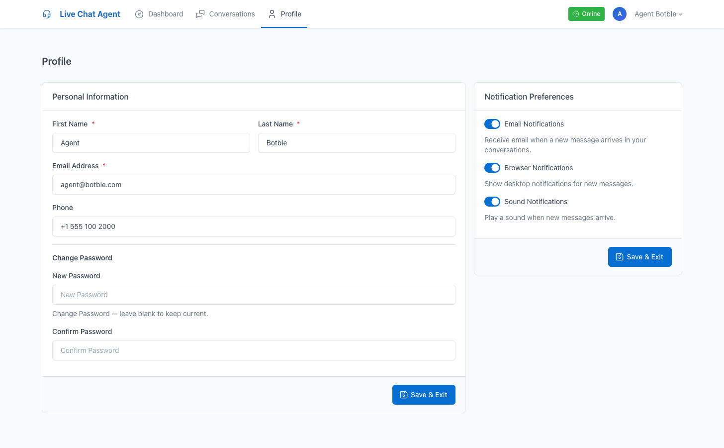 Dedicated agent dashboard with stats, messenger, profile. Separate login at /agent.